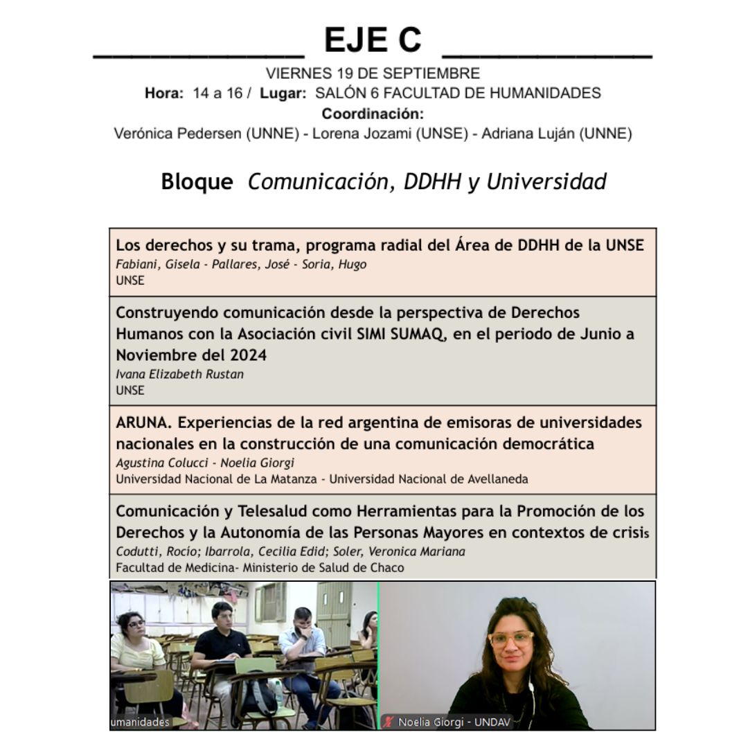El Congreso de DDHH del Norte Grande Argentino, que se realizó bajo el lema “Participar. Resistir. Abrazar. Construir con Memoria”, fue organizado por el Área de Derechos Humanos de la Universidad Nacional de Santiago del Estero (UNSE) y la Cátedra Libre de Derechos Humanos y Participación Ciudadana de la Universidad Nacional del Nordeste (UNNE), en articulación con la Red Interuniversitaria de Derechos Humanos del Consejo Interuniversitario Nacional (CIN), y se llevó a cabo los días 19 y 20 de septiembre en Resistencia, Chaco, en modalidad híbrida.